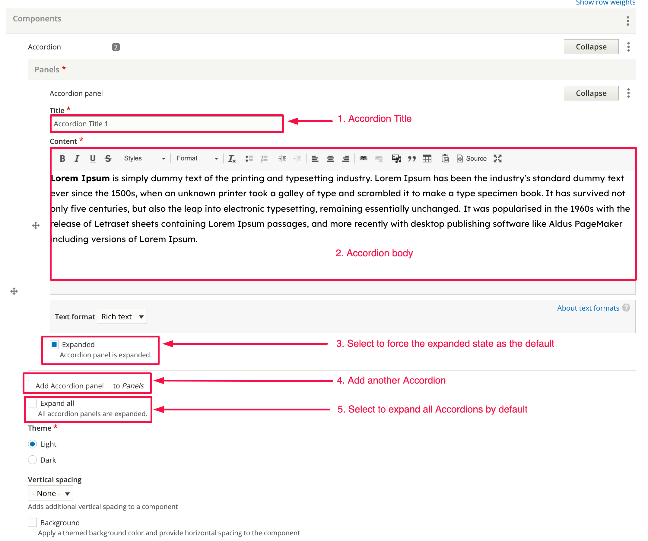 4. Add Accordion panel - Click this button to add additional Accordion panels.