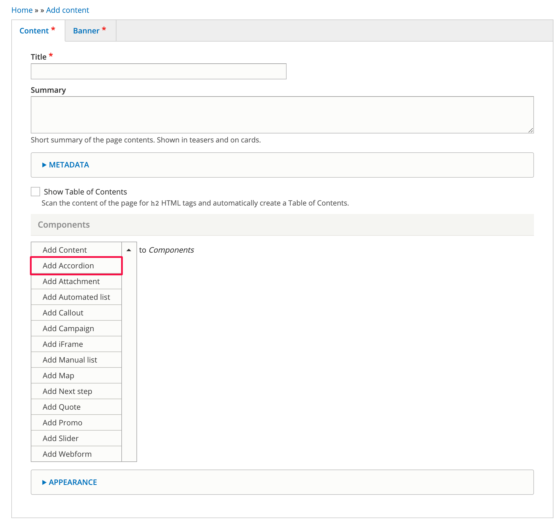 Click on “Add Accordion” as shown below.