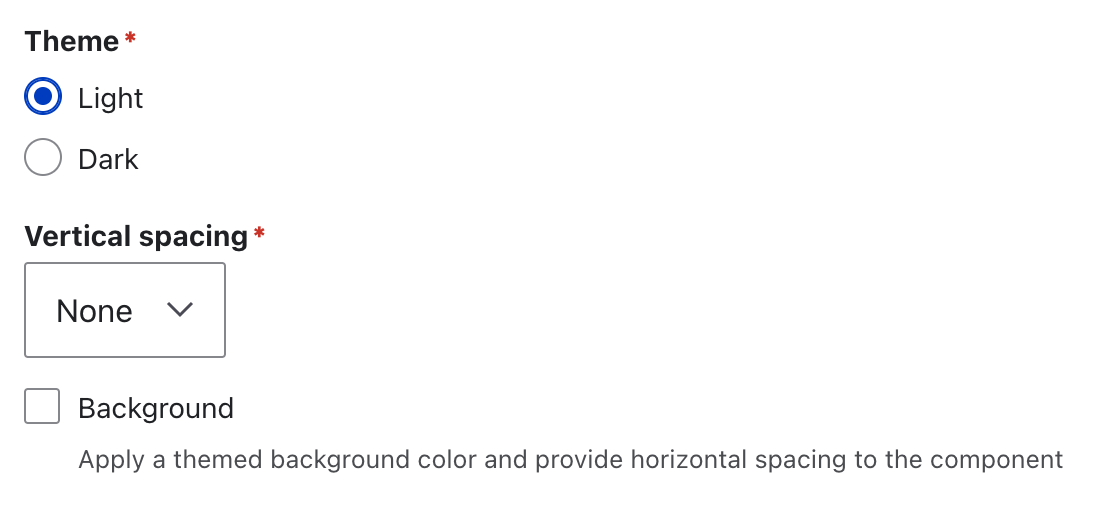 Vertical spacing adds space before, after or both before and after a component. It is used to visually separate a component from other components when they are vertically stacked on the page. Use "Vertical spacing" dropdown to chose the appropriate values.