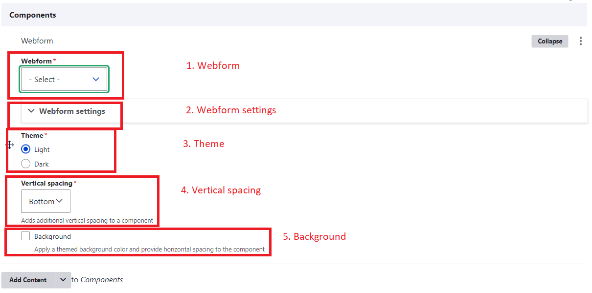 1. Webform - Select a webform from the dropdown (note, before adding webforms to a page you'll need to create the webform).