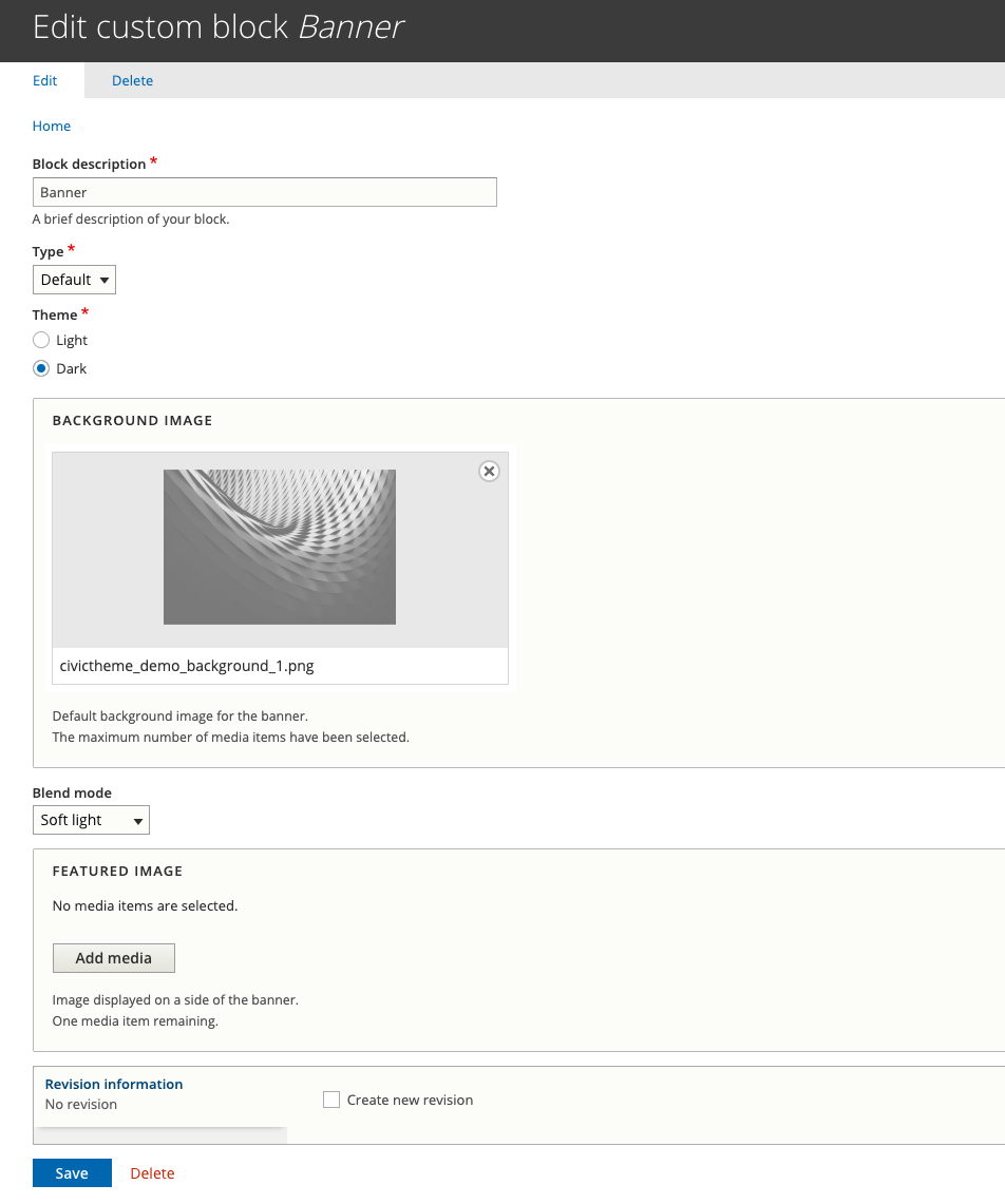 4. **Add a background image.** By default your CivicTheme site will display a solid colour in the banner background area. The colour will depend on the theme and colours you've chosen for the site. You can override the background colour by adding an image. The theme chosen above will affect this image.