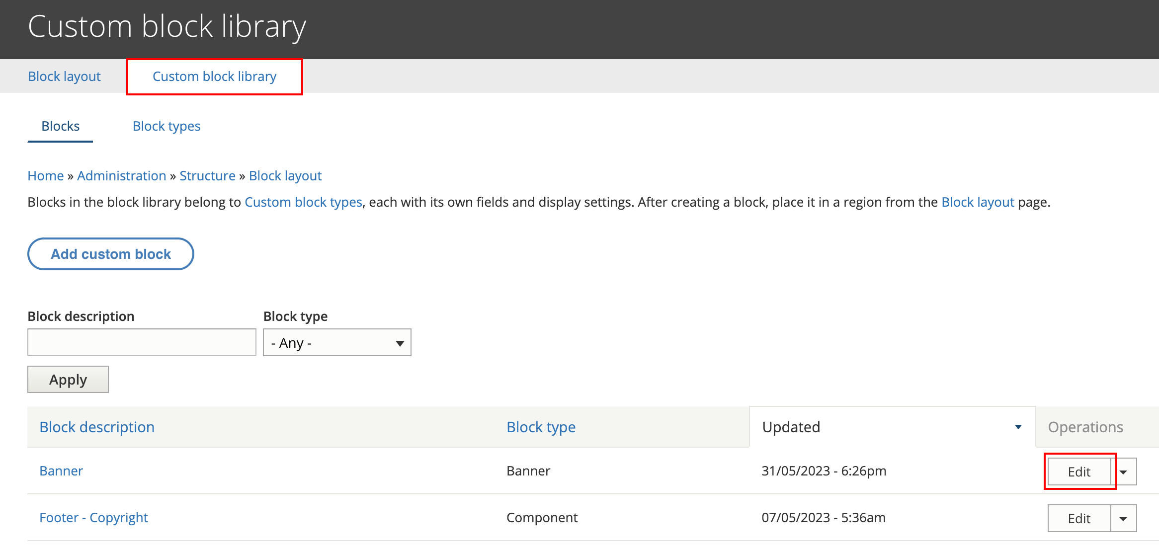 3. Look for 'Banner' in the list of blocks (or use the 'Block type' filter and filter for 'Banner') and select 'Edit'.