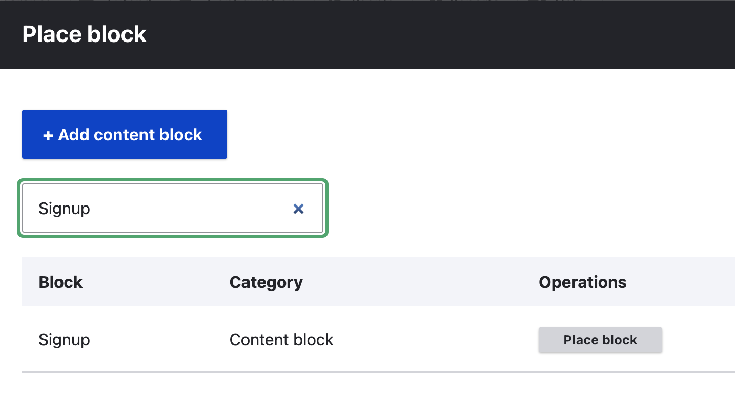 Because the Signup is a Block, you can configure it to display globally. For example, if you want to display the Signup just above the footer on every page, you can configure to display in the `Content bottom` region.