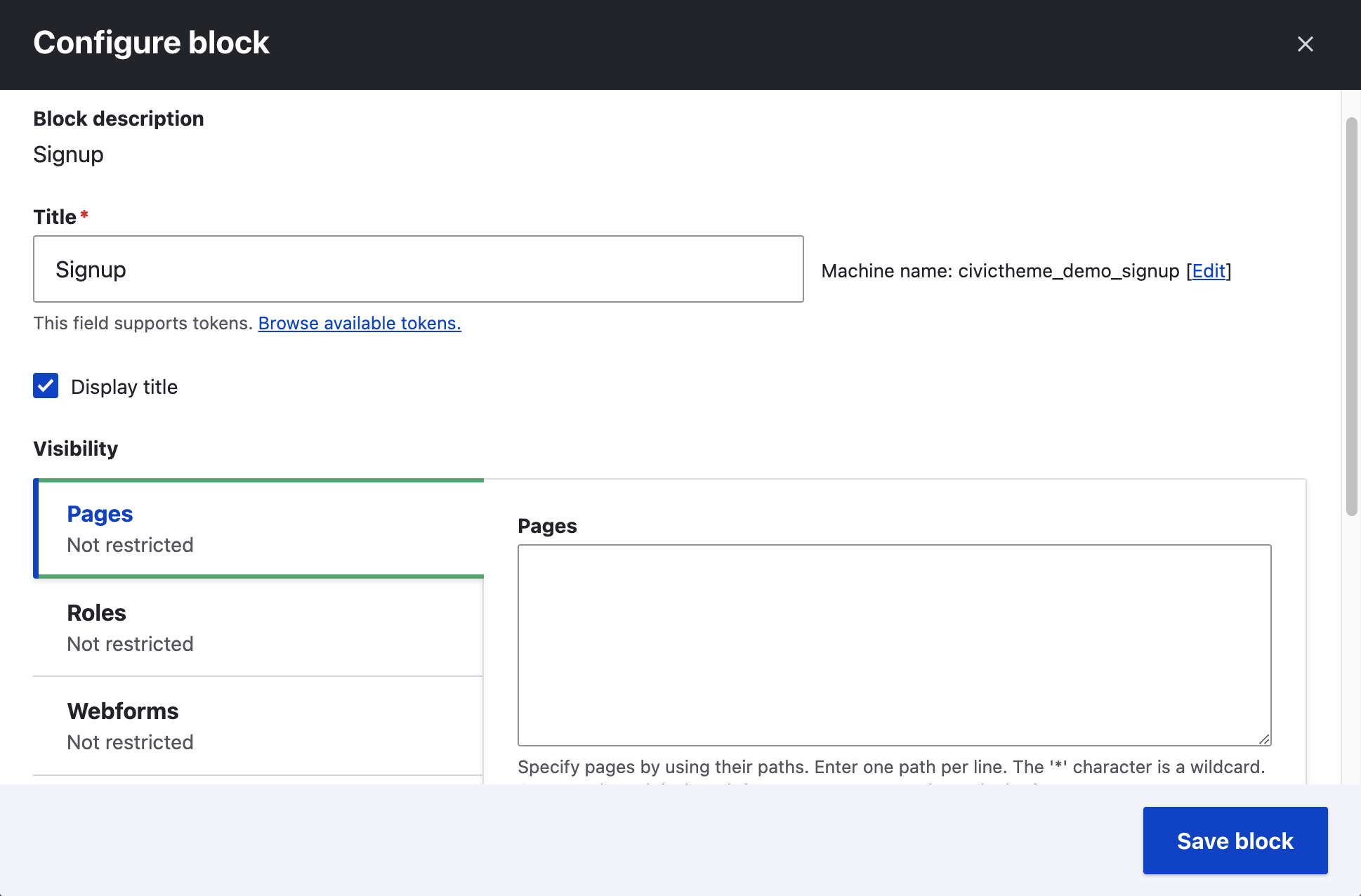 6. A pop up will open. In here you can configure the block to stop it displaying on certain pages.