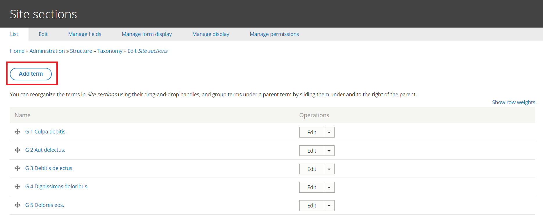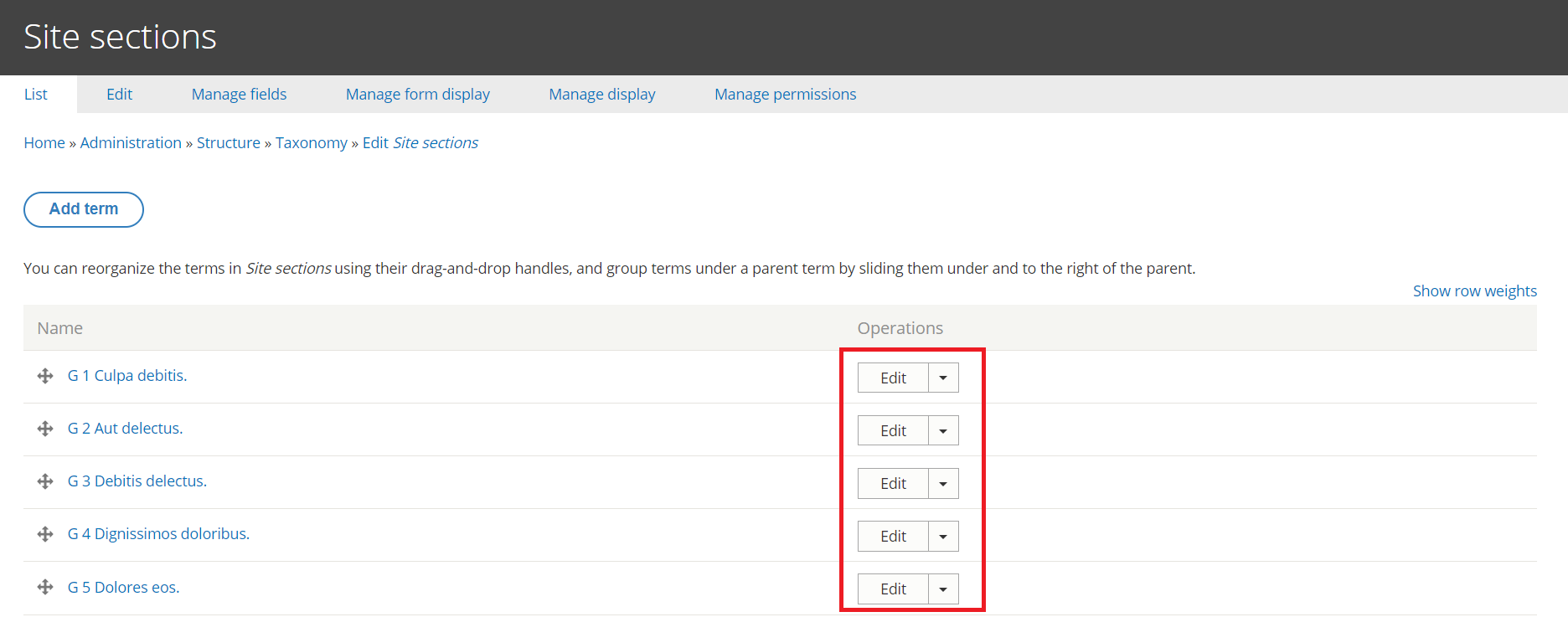 You can edit existing site sections by firstly selecting List terms from the dropdown menu next to 'Site sections'.