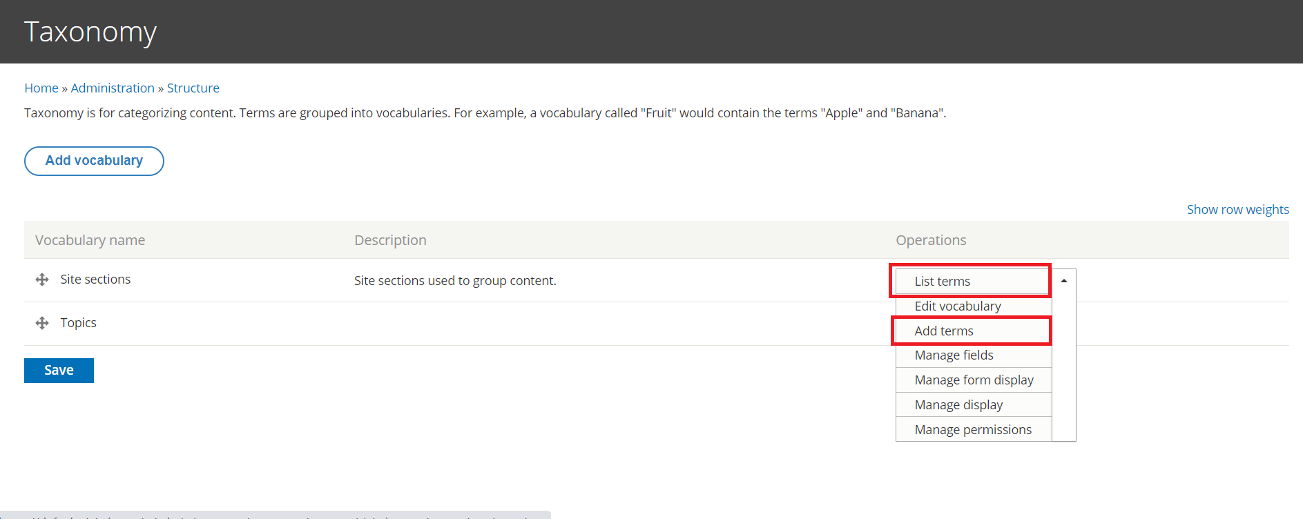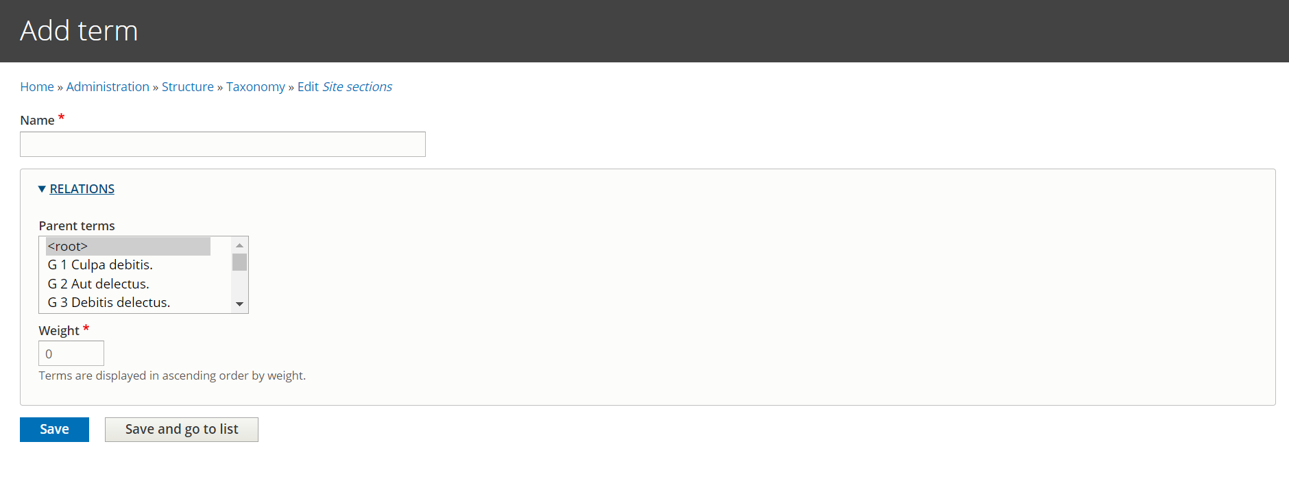 Add in the name, relationships (parent terms) and menu item weight and then click Save.