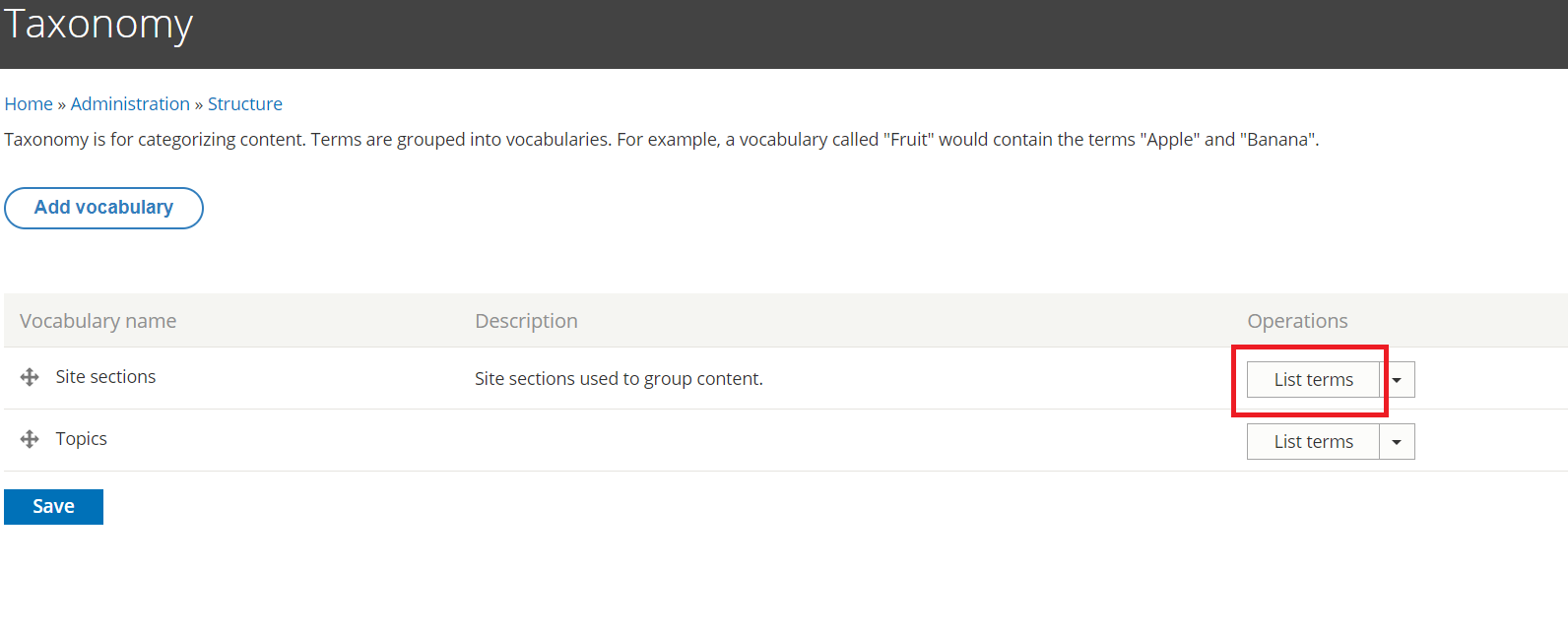 You can add a new site section by clicking on List terms or Add terms from the dropdown menu to the right of 'Site sections'.