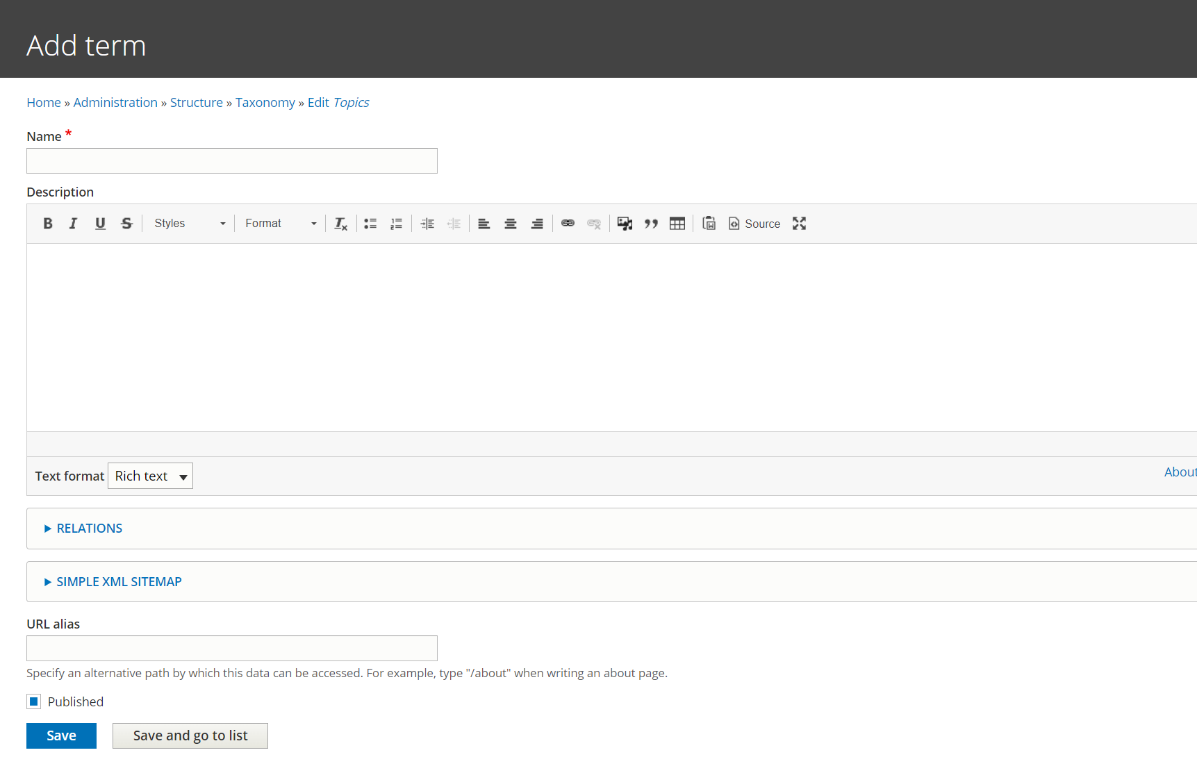 Note: You also have the option of adding in parent terms under the 'Relations' area and choosing how you want Topics to be treated in the site map.