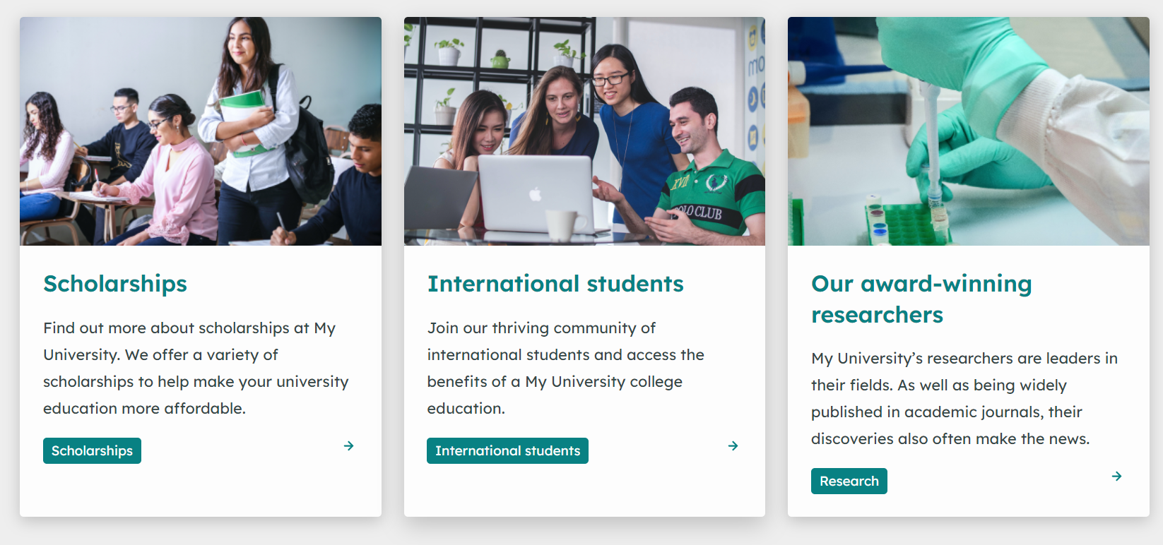 Below you can see three news card showing three different topics - Scholarships, International students, and Research.
