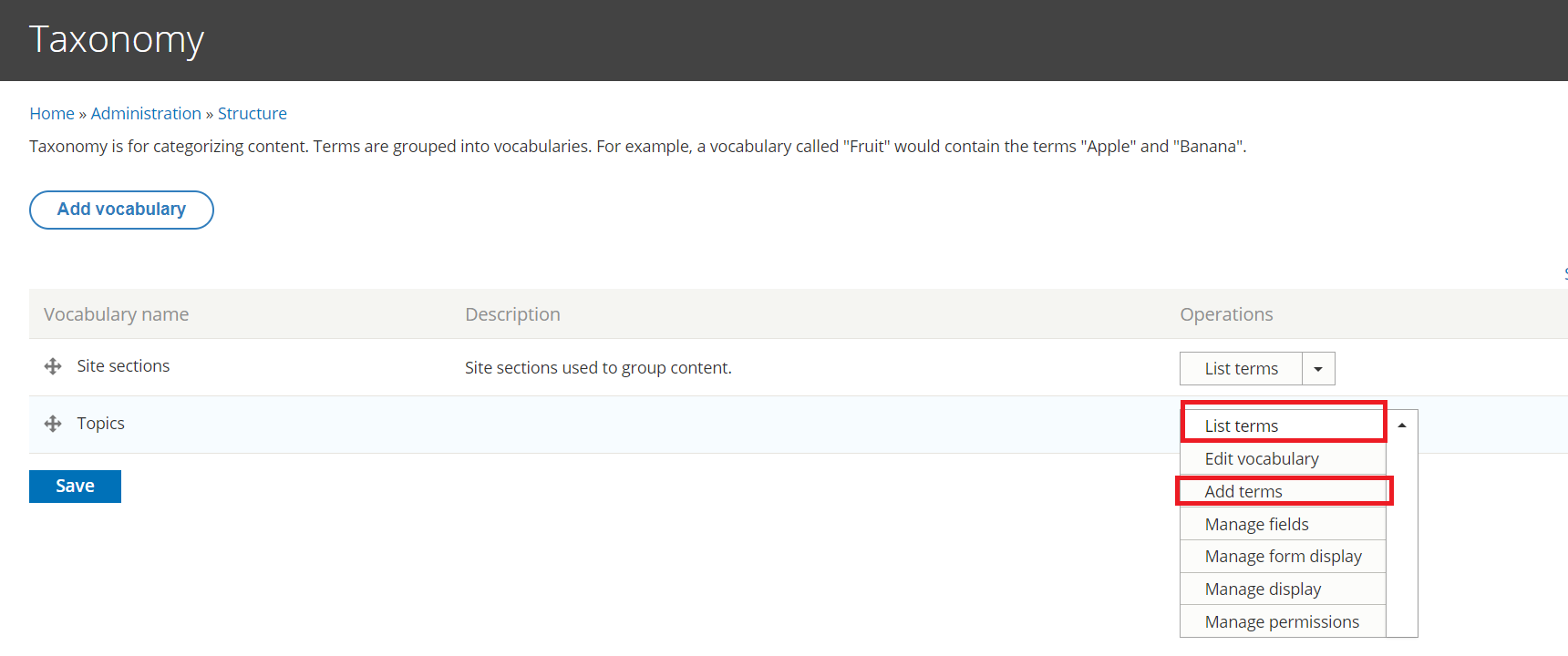 You can add a new topic by clicking on List terms or Add terms from the dropdown menu to the right of 'Topics'.