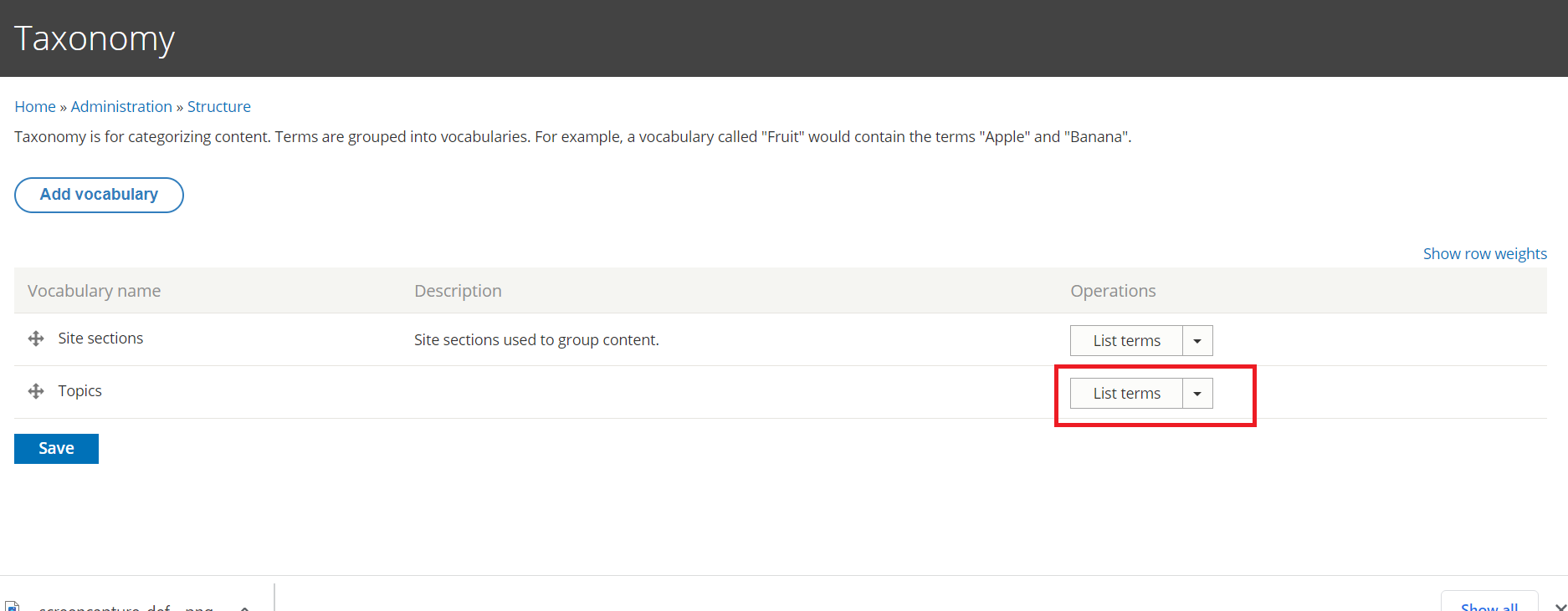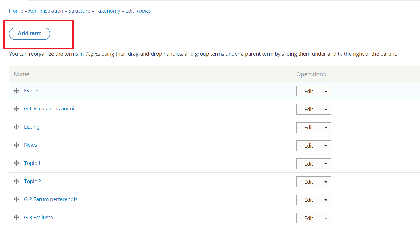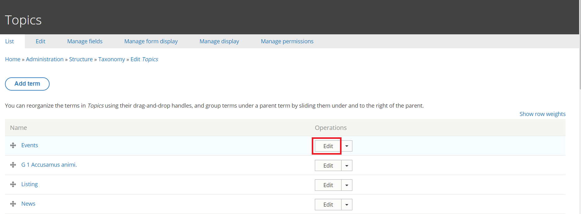 You can edit existing topics by firstly selecting List terms from the dropdown menu next to 'Topics'.